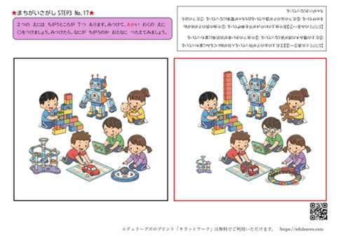 今回ご紹介するのは、プレイルームで遊ぶ子どもたちをテーマにした 間違い探しプリント です。