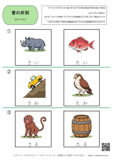 そこで今回、文字に頼らず、絵を手掛かりに音の弁別練習ができるプリントを用意しました。