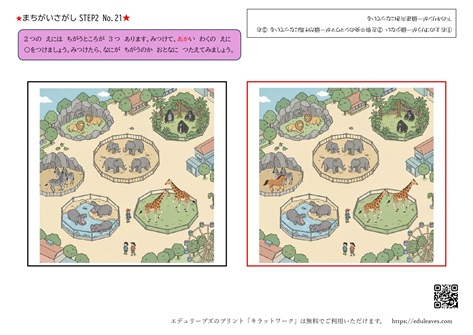 にぎやかな動物園のイラストを見比べながら、2枚の絵の中にある3つの違いを探していきます。