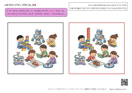 子どもたちがおもちゃで自由に遊べるプレイルームをテーマにした、かんたんな間違い探しプリントです。積み木や車、お人形など、子どもたちにとって身近なおもちゃがたくさん描かれており、