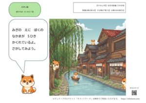 落ち着いた町並みの中に、ちょこんと紛れ込んだ柴犬を探す課題で、