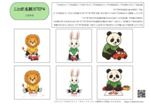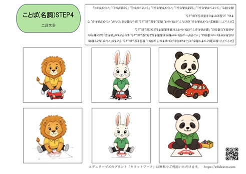 動物×動作の二語文を楽しく学ぶプリントのご紹介 文の練習 2026.02.16 「ライオンがあそぶ」「うさぎがあそぶ」「パンダがあそぶ」「ライオンがかく」「うさぎがかく」「パンダがかく」 といった 〈動物+動作〉の二語文 を聞いて理解したり、自分で言葉にして表出したりする練習ができるプリントを作りました。 シンプルな構造だからこそ、ことばの基礎をしっかり育てることができます。動物が登場するので、小さなお子さんでも楽しく取り組めます。 ご家庭でも、療育やことばの指導の場でも使いやすい一枚です。二語文のステップアップに、ぜひご活用ください。