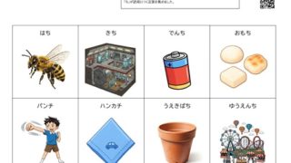 こちらの教材は専門家の方と相談しながら行っていただくものとなります。構音練習用の教材としてターゲットとなる音が入っていることばを集めたプリントを作成しています。今回は語尾に「ち」がつくことばを集めたプリントです。構音練習では、ターゲットの音...