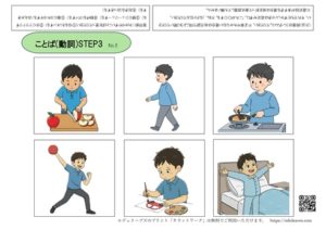 動詞STEP3(6択) 2025.01.02 ことばの理解 動詞STEP3 STEP2で問題なく選択できるようになってきたら、選択肢の数を増やして学習してもよいと思います。6択が厳しい場合は、左側の上下2列、あるいは右側の上下2列の絵を裏に折って4択にしてもかまいません。 ①食べる・寝る他 ②切る・すべる他 ③切る・歩く他 ④着る・とぶ他 ⑤押す・立つ他 ⑥のぼる・あげる他